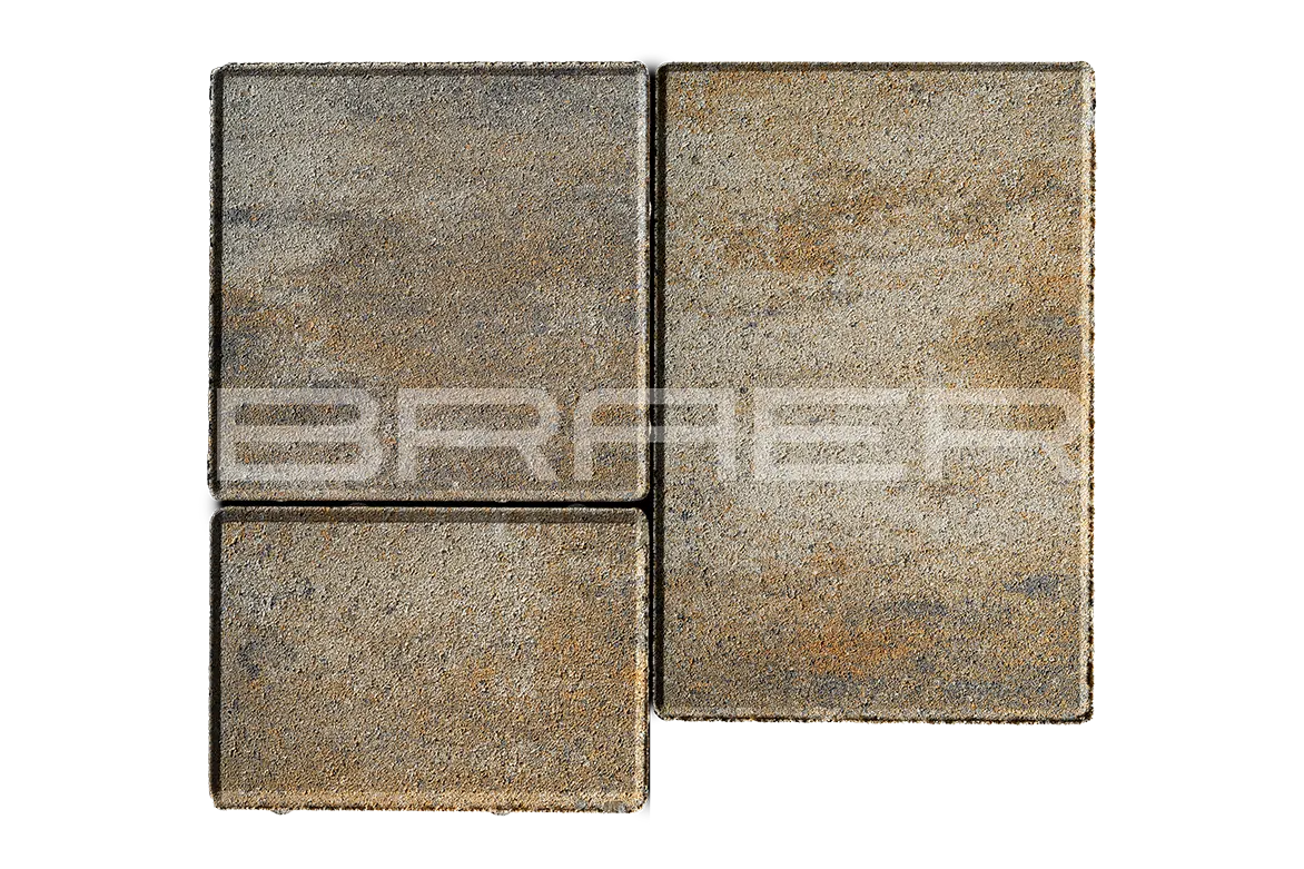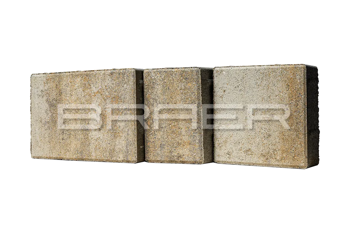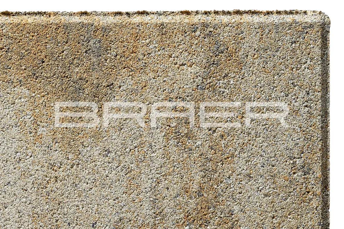 Тротуарная плитка BRAER состоит из 2 слоев: основного и лицевого. Технология двойного вибропрессования позволяет поэтапно уплотнить слои, что увеличивает прочность продукции. Основной слой содержит высокопрочный цемент и гранитный щебень, а лицевой (10% толщины) – мелкофракционный песок, белый цемент и пигменты.