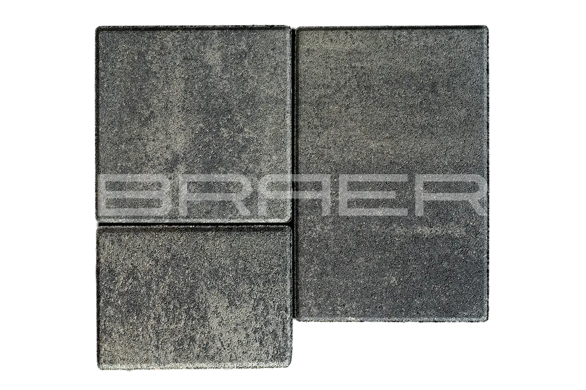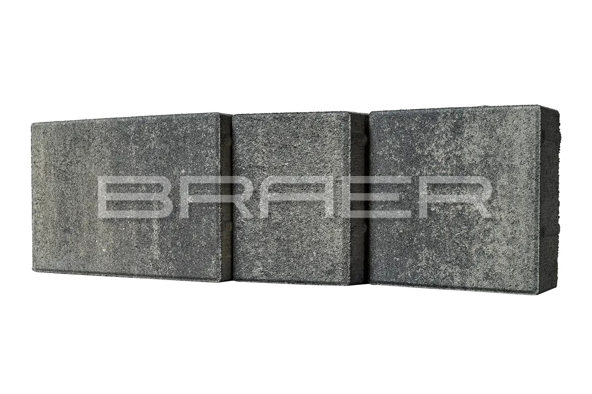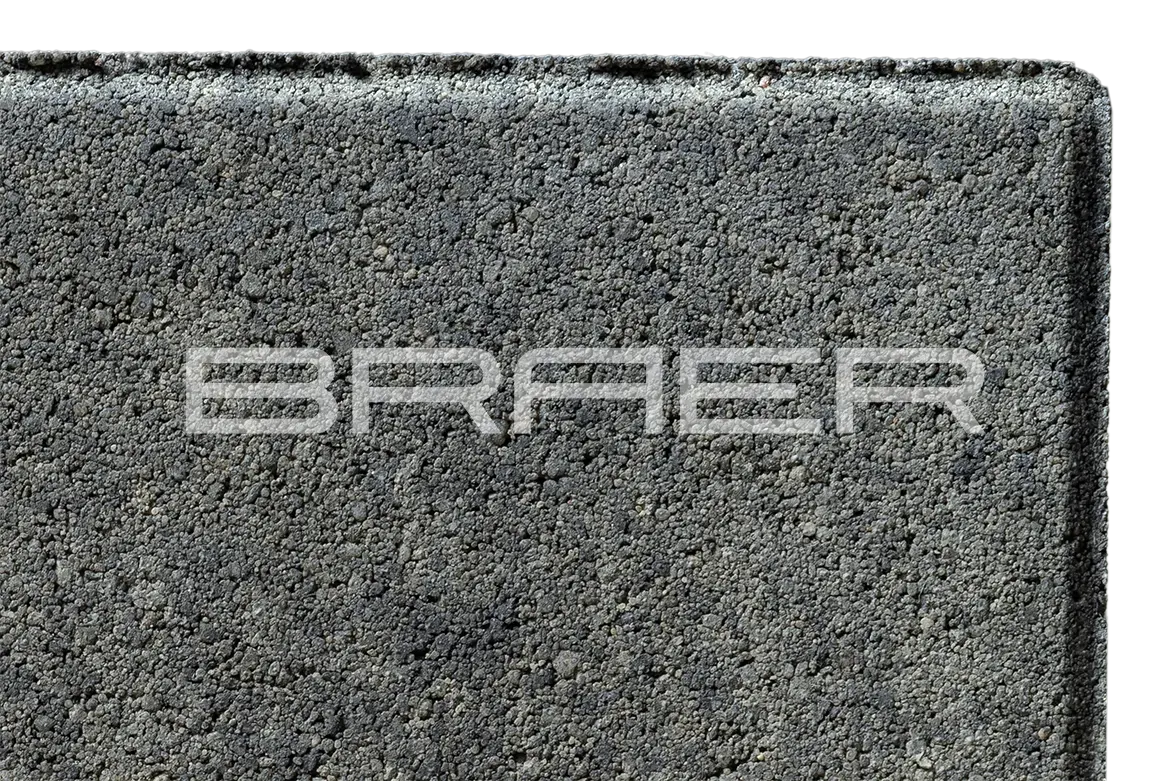 Тротуарная плитка BRAER состоит из 2 слоев: основного и лицевого. Технология двойного вибропрессования позволяет поэтапно уплотнить слои, что увеличивает прочность продукции. Основной слой содержит высокопрочный цемент и гранитный щебень, а лицевой (10% толщины) – мелкофракционный песок, белый цемент и пигменты.
