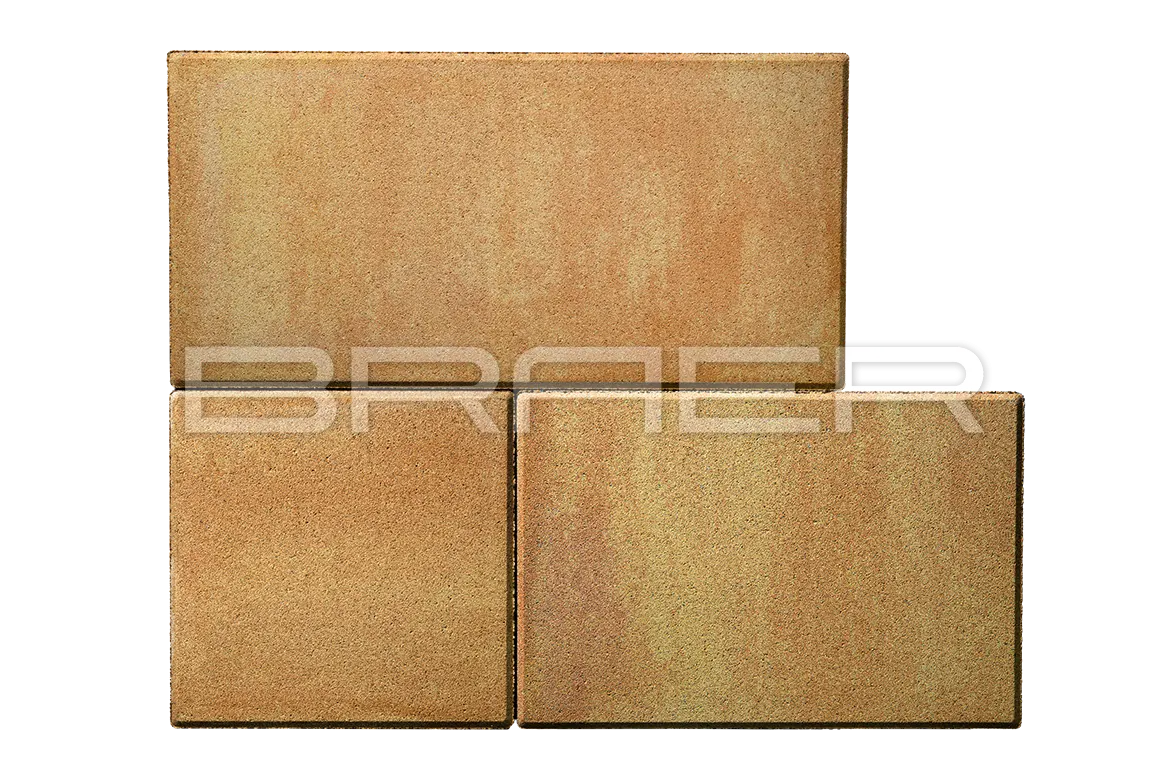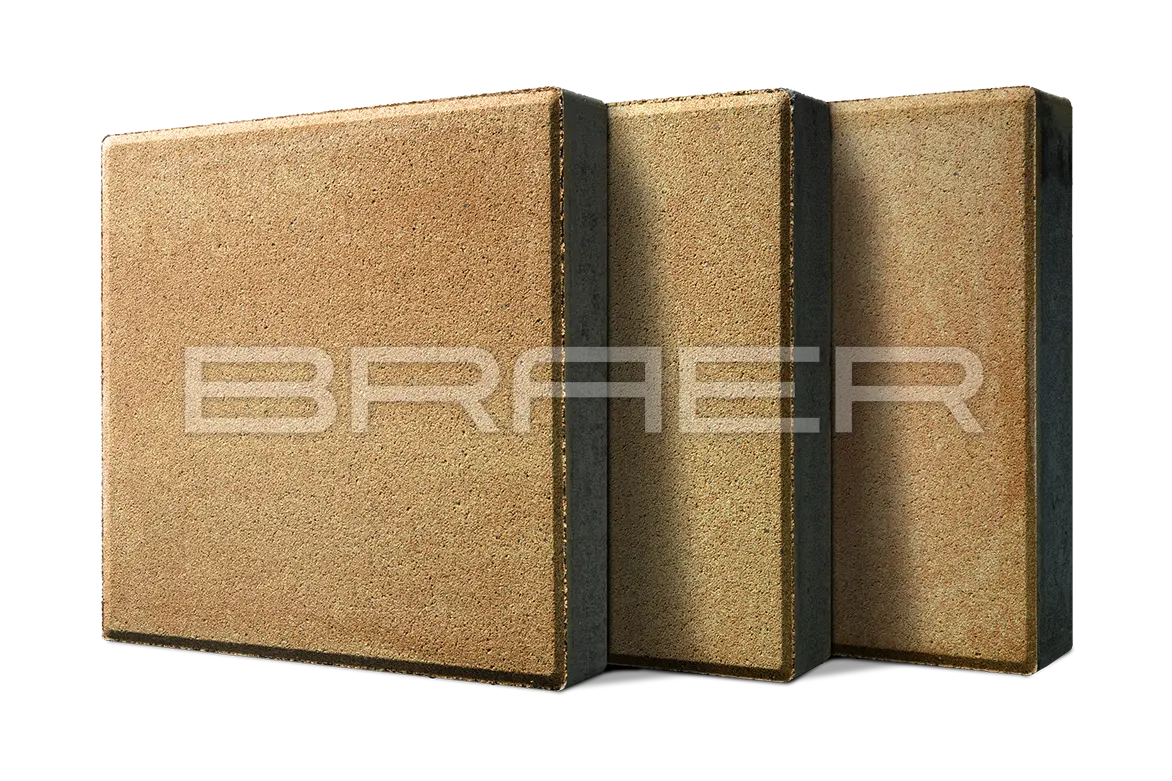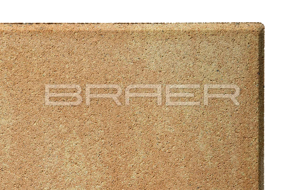 Тротуарная плитка BRAER состоит из 2 слоев: основного и лицевого. Технология двойного вибропрессования позволяет поэтапно уплотнить слои, что увеличивает прочность продукции. Основной слой содержит высокопрочный цемент и гранитный щебень, а лицевой (10% толщины) – мелкофракционный песок, белый цемент и пигменты.