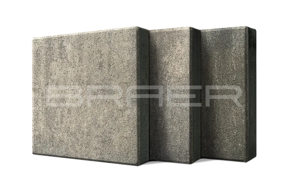 Тротуарная плитка BRAER состоит из 2 слоев: основного и лицевого. Технология двойного вибропрессования позволяет поэтапно уплотнить слои, что увеличивает прочность продукции. Основной слой содержит высокопрочный цемент и гранитный щебень, а лицевой (10% толщины) – мелкофракционный песок, белый цемент и пигменты.