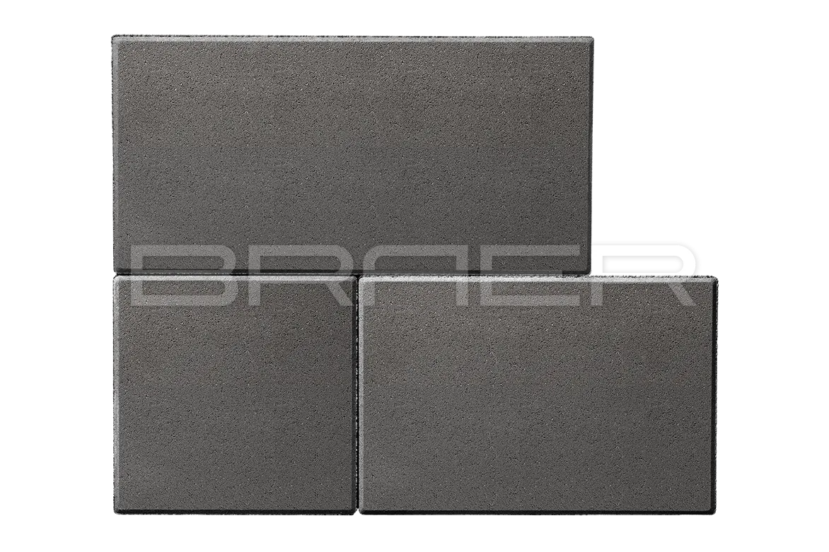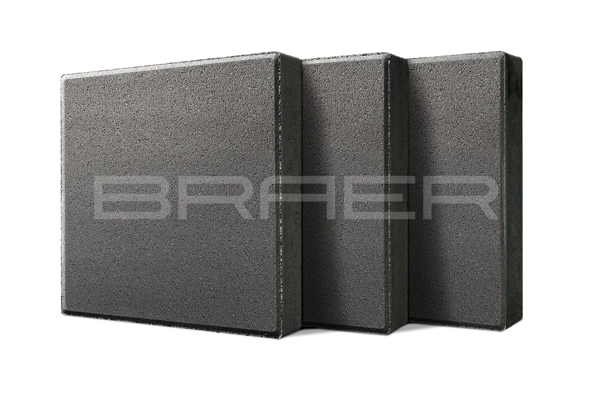 Тротуарная плитка BRAER состоит из 2 слоев: основного и лицевого. Технология двойного вибропрессования позволяет поэтапно уплотнить слои, что увеличивает прочность продукции. Основной слой содержит высокопрочный цемент и гранитный щебень, а лицевой (10% толщины) – мелкофракционный песок, белый цемент и пигменты.