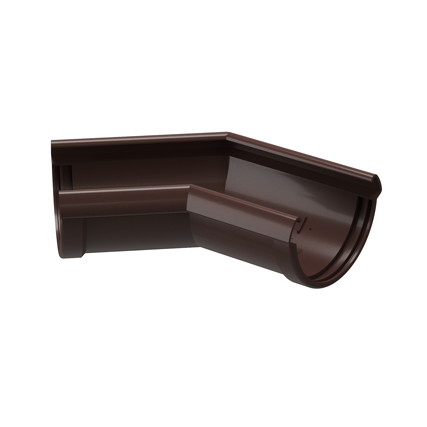 Угол для соединения желобов окрашен в цвет «Шоколад» и служит для соединения двух желобов серии «Premium» такого же цвета под внутренним или внешним углом 135 градусов.