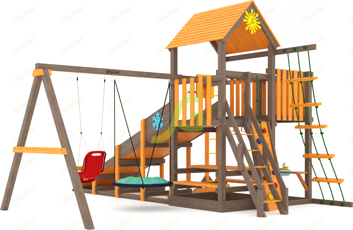 Обращаем Ваше внимание, что цвет установленной детской площадки может отличаться от представленных изображений на сайте. Специфика окраски нетоксичными пропитками допускает отклонения в цветовой гамме отгружаемых изделий вследствие различного цвета натурального природного сырья и естественных компонентов, используемых для производства площадок.