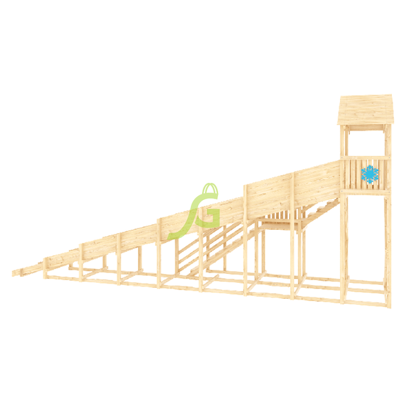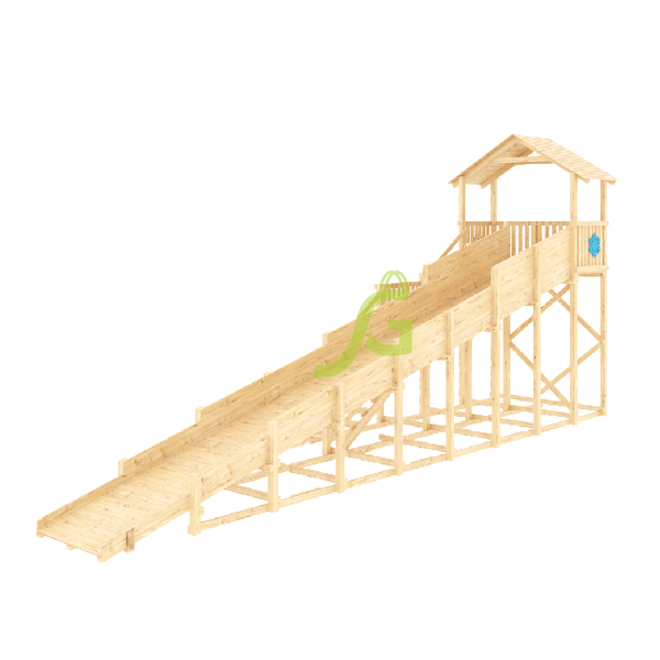 10-ти метровый скат безопасен для катания детей дошкольного возраста, потому что он имеет оптимальную высоту. Дети могут подниматься вверх по удобной лестнице, держась за перила. Площадка в верхней части достаточно просторная и оборудована деревянной крышей. Она позволит ребятам укрыться от обильных осадков, ветра, весело общаясь друг с другом.
